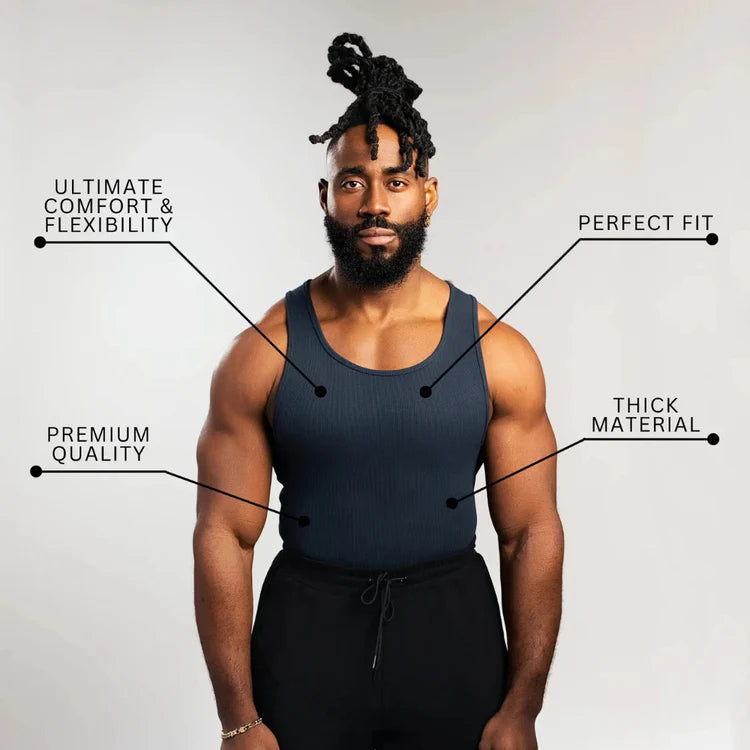 Fit and fabric. Ours is 340GSM cotton-spandex — smooths out your frame and holds shape after every wash. Cheap tanks ride up, cling, and make you look sloppy.